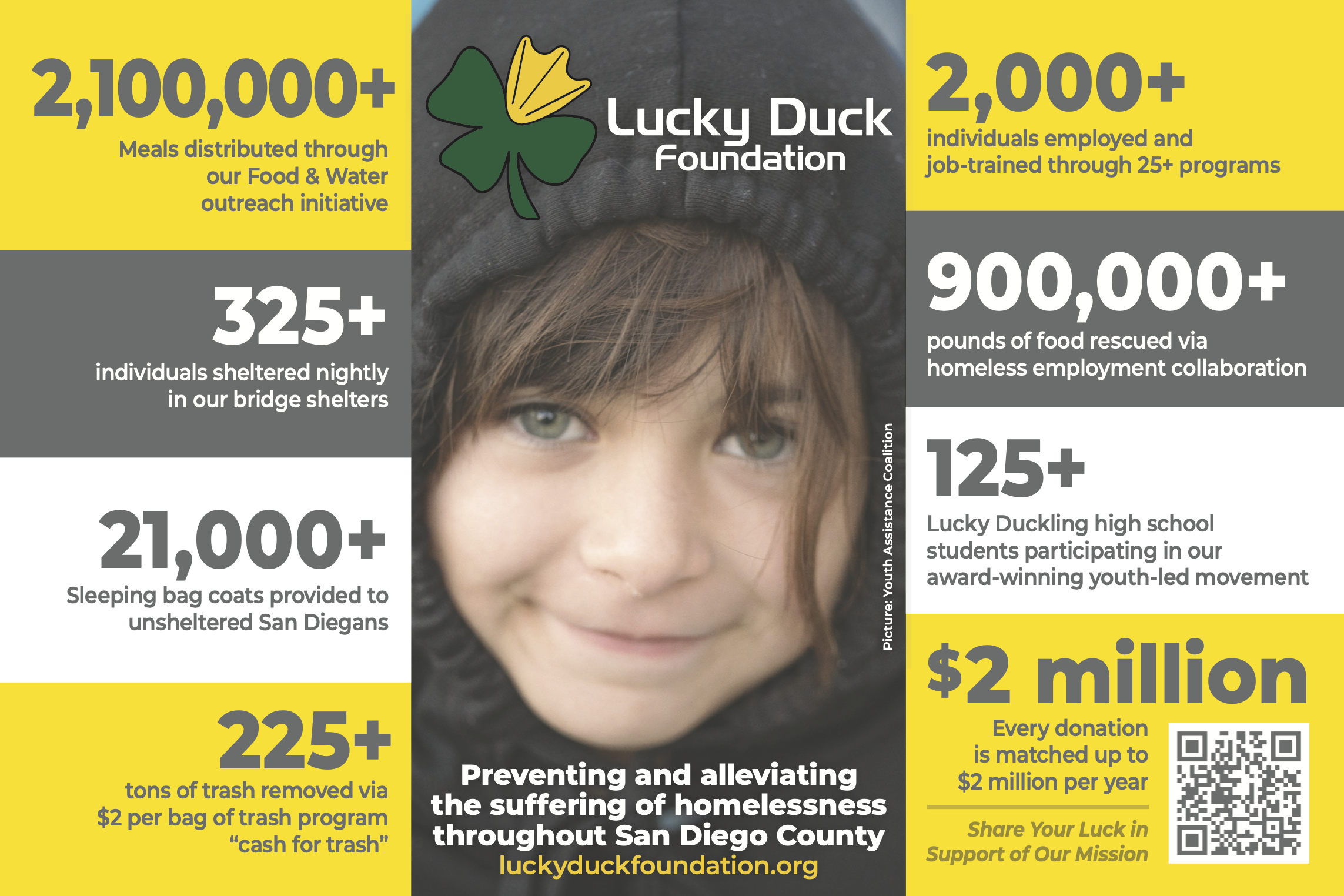 You see those struggling and suffering with homelessness in San Diego and your heart breaks. So many people are experiencing homelessness due to sickness, mental illness, domestic violence, loss of job, loss of home, or other circumstances out of their control. You want to help, but where do you start? What local efforts are there to choose from? Which ones will make the most of your donation? Enter the Lucky Duck Foundation.