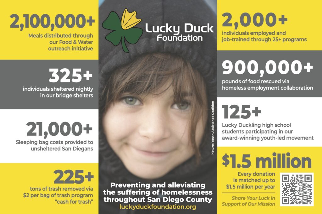 “Lucky Duck Foundation’s mission is critical to my wife, Karen and myself. They support trying to better individuals who are homeless in San Diego County. We feel fortunate to be able to work with the Lucky Duck Foundation Team, a group of people who are firmly committed to making San Diego County a better place for our sisters and brothers who happen to be homeless.”